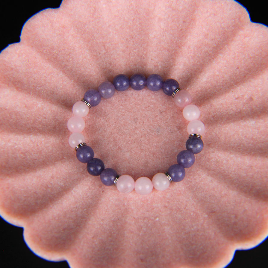 Le bracelet Éthera réunit le quartz rose, symbole d’amour et de douceur, et le jade lavande, pierre d’équilibre et de calme émotionnel.