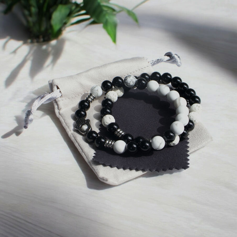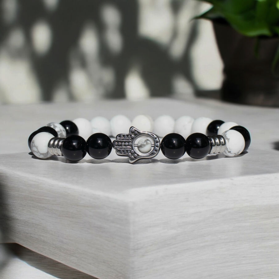 Here is the Khamsa hand energizing bracelet, a captivating fusion of precious materials to enhance your wrist. Crafted with black onyx, black glass, white lava stone, and marbled glass beads, this set embodies the balance between elegance and strength.